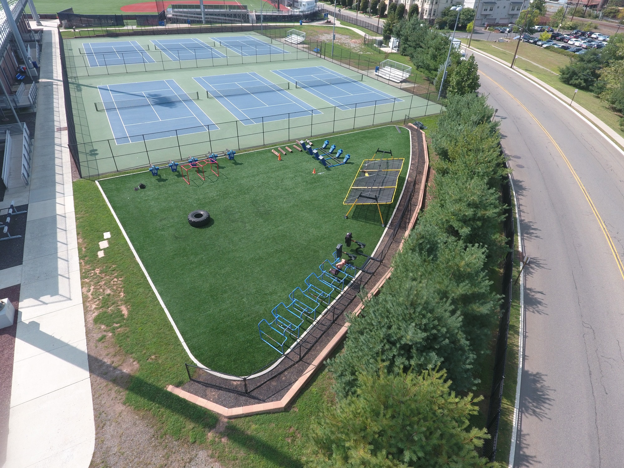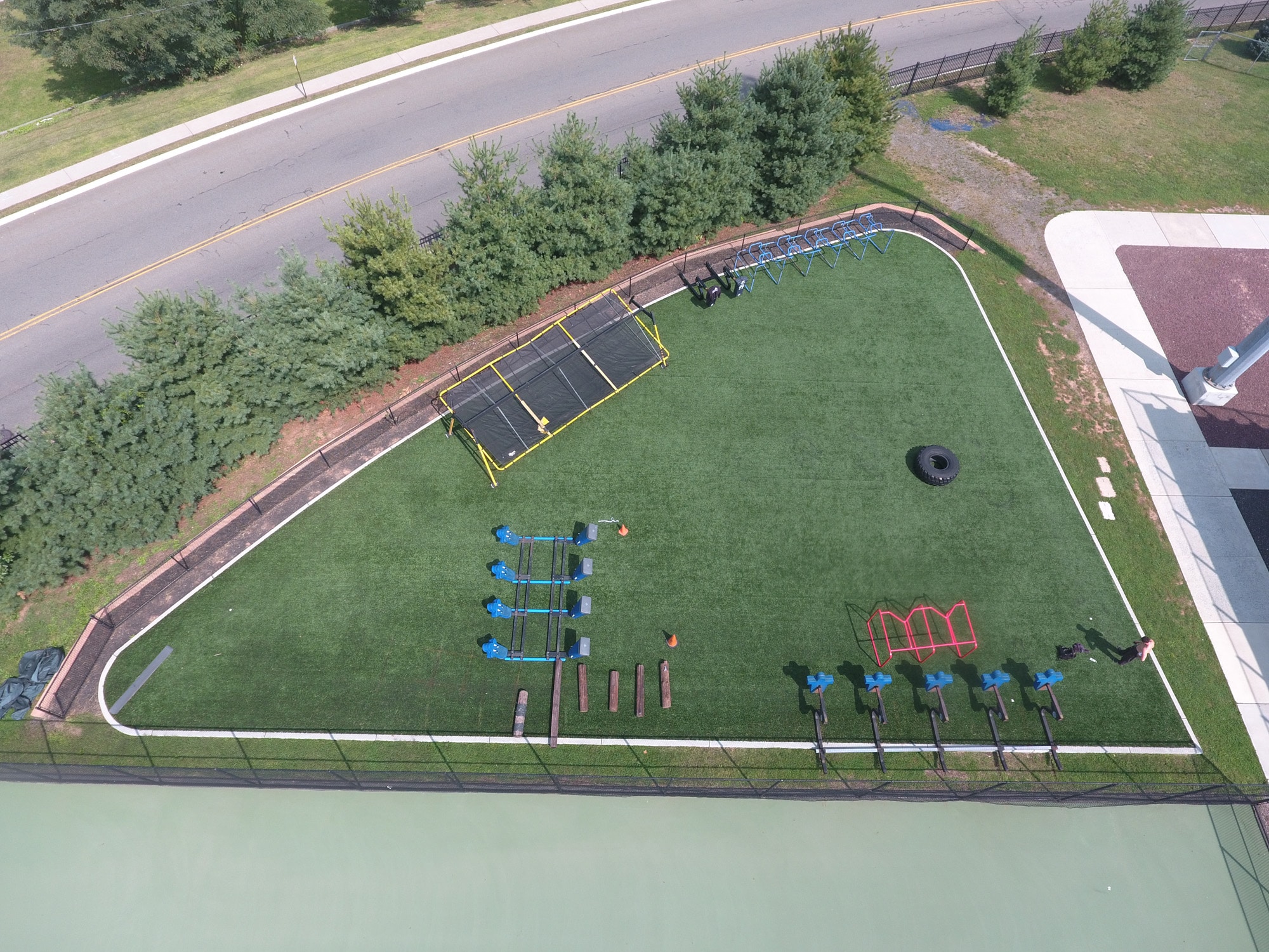The project involved the replacement of existing synthetic turf and track surfacing with custom color blue, reconfiguration of the D-zones, addition of new trench drain, black vinyl coated fence and gates, new goal posts, all new in-ground equipment, decorative paver walkway and retaining walls along with the turnkey construction of an additional synthetic turf speed and strength training area adjacent to the field.