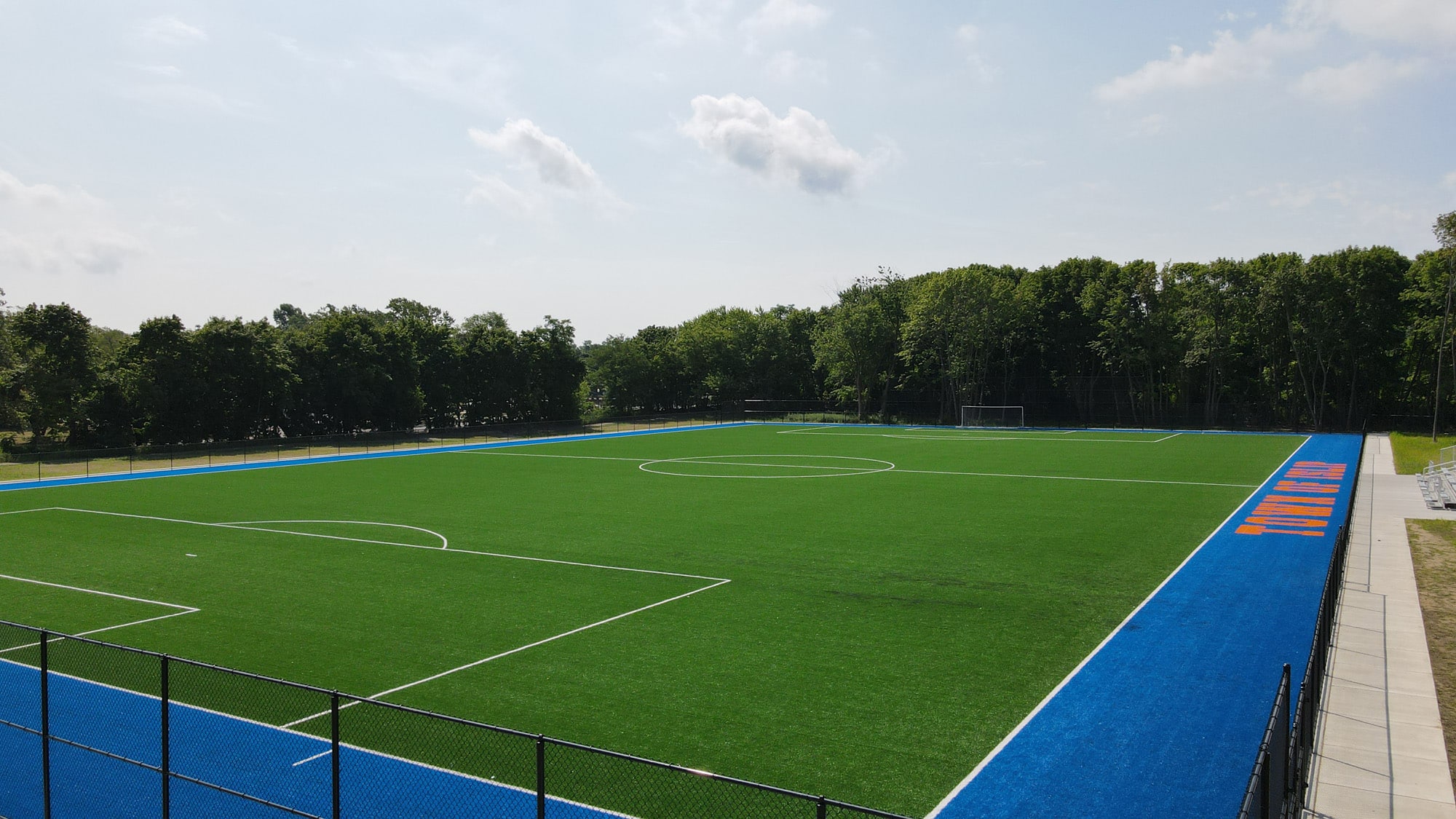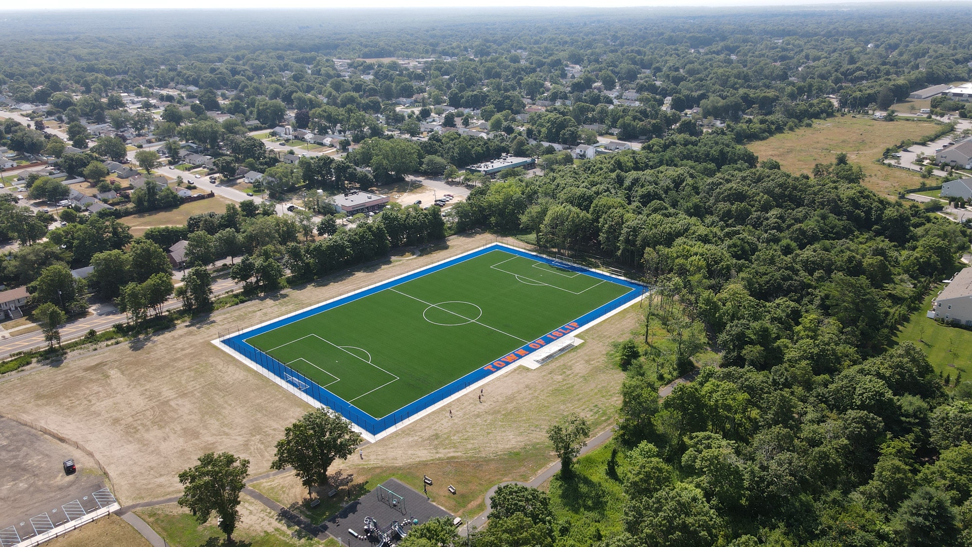 The LandTek Group® constructed a brand-new turnkey soccer complex in Central Islip, NY. The 93,000 sq.ft. synthetic turf field is surrounded by perimeter fencing and ball stop netting. New concrete paths were constructed along with new bleachers. The construction of the complex included the construction of a stormwater detention system, drainage, a stone base and laser grading.