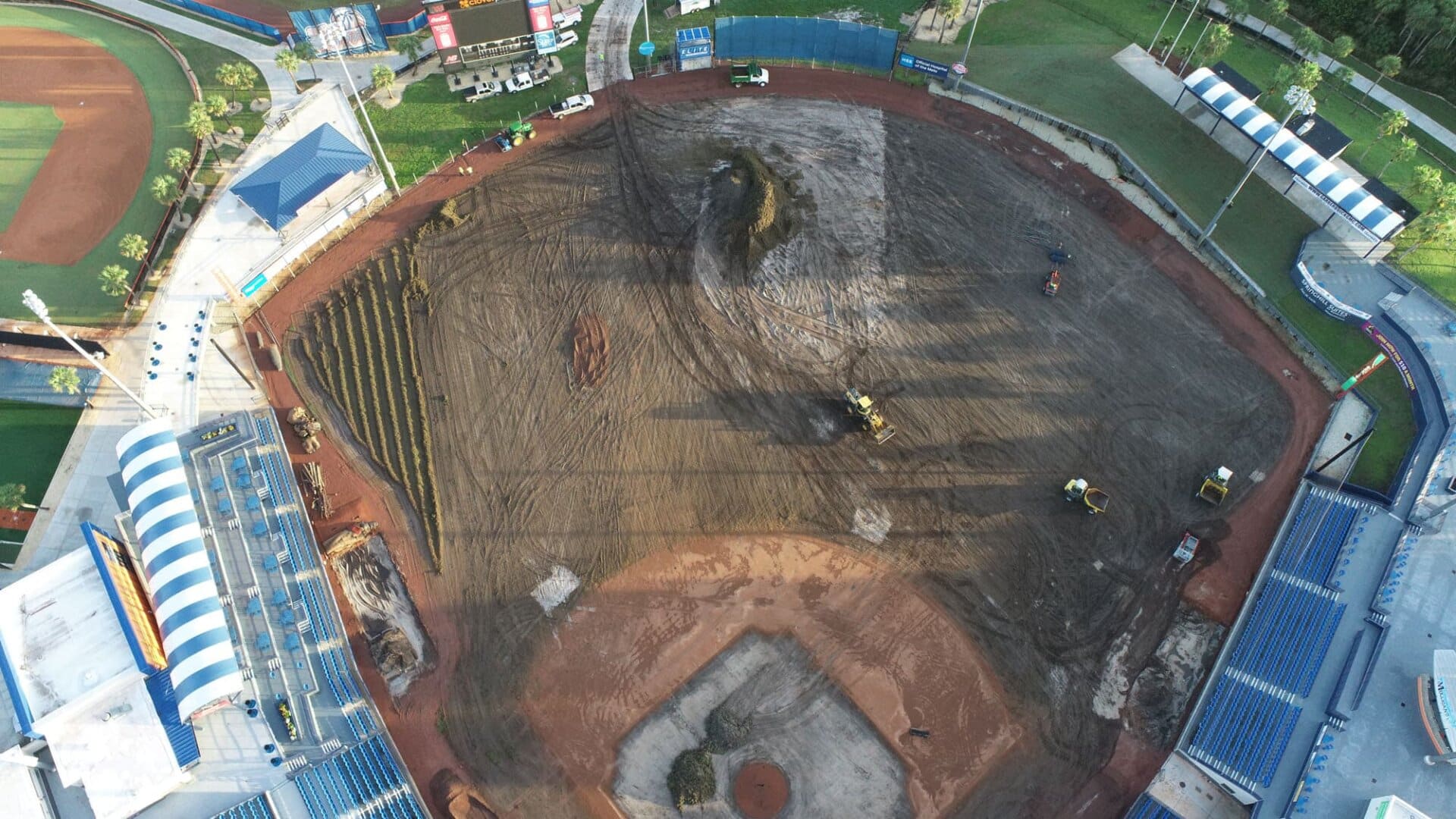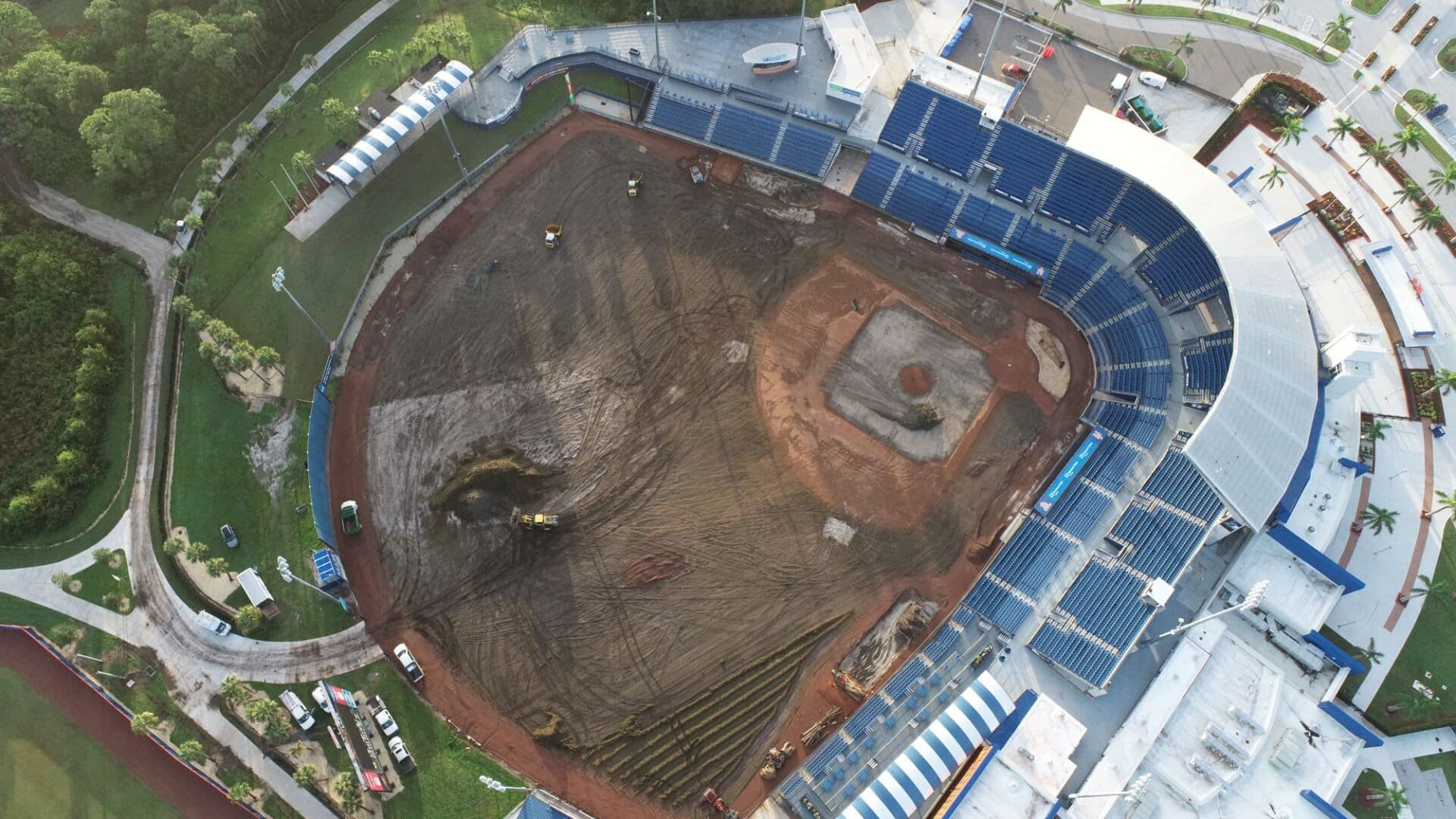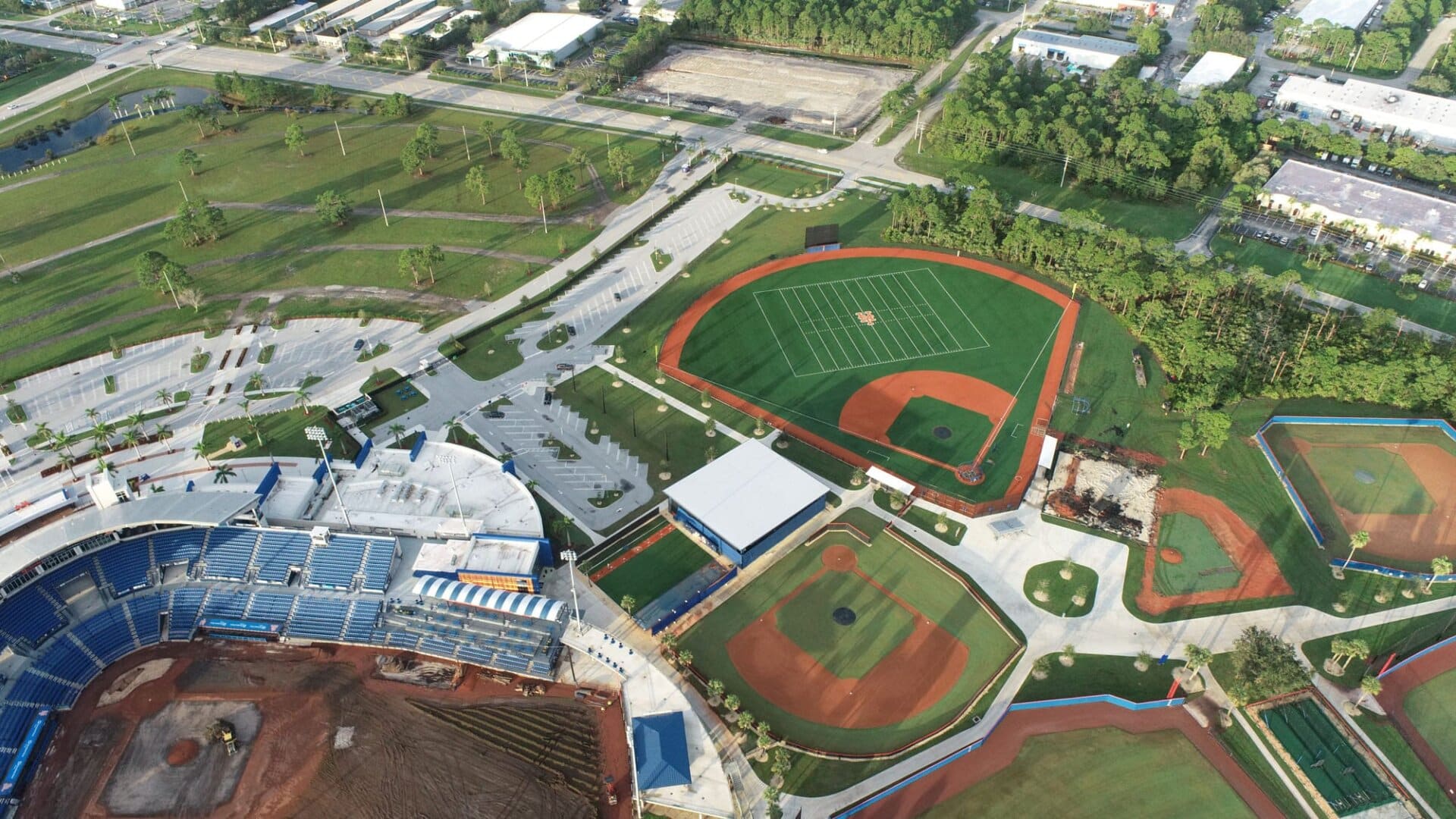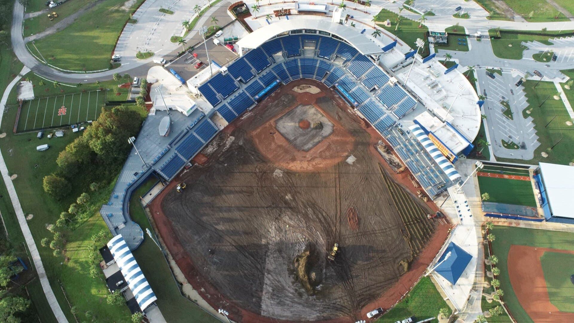 The LandTek Group® successfully executed the NY Mets Clover Park Stadium Renovation Project in Port St. Lucie, FL. This project included several key components, such as the installation of new synthetic turf featuring specialized elements like a home plate halo and the NY Mets logo, as well as a visitors bullpen and porous pad. To ensure optimal drainage, we meticulously implemented a subsurface permeable aggregate base, a sub-drainage piping system, and treated wood edgers and nailers. Additionally, the renovation involved the removal of the existing outfield fence and the installation of a new fence, enhancing both the functionality and appearance of the stadium.