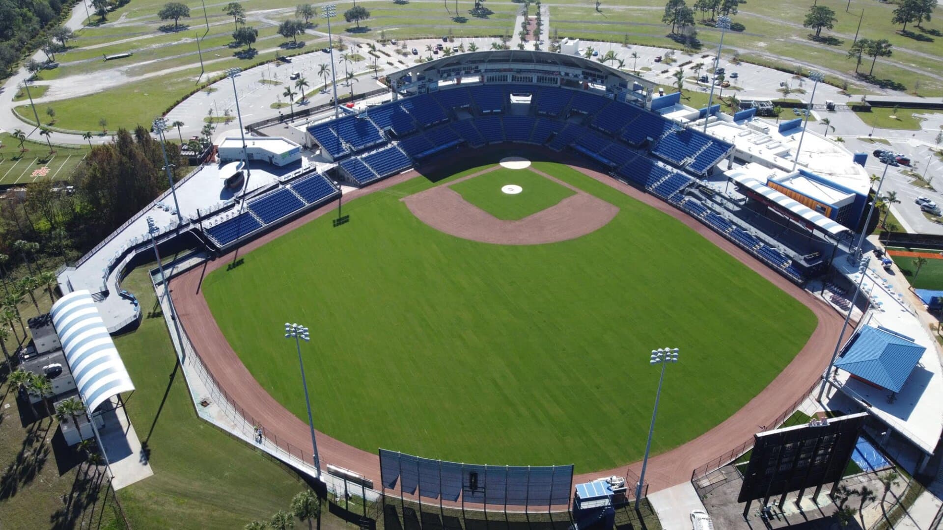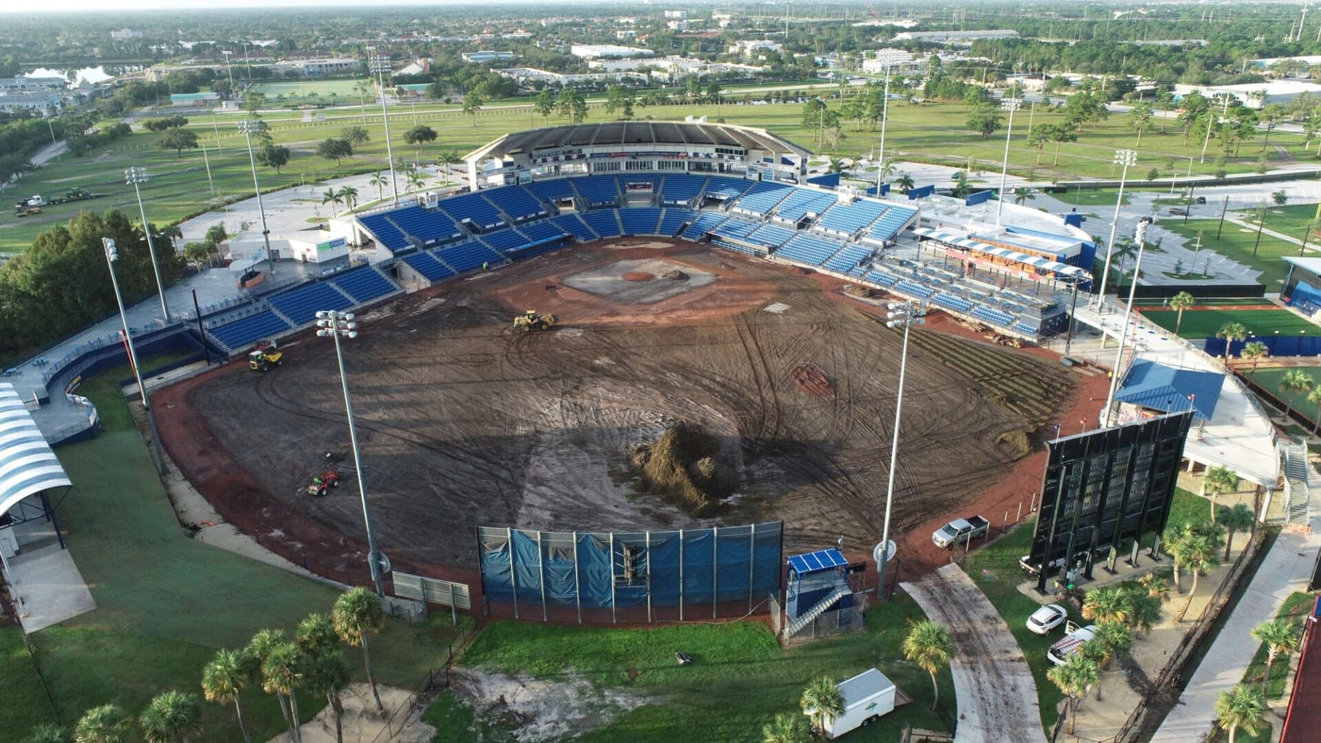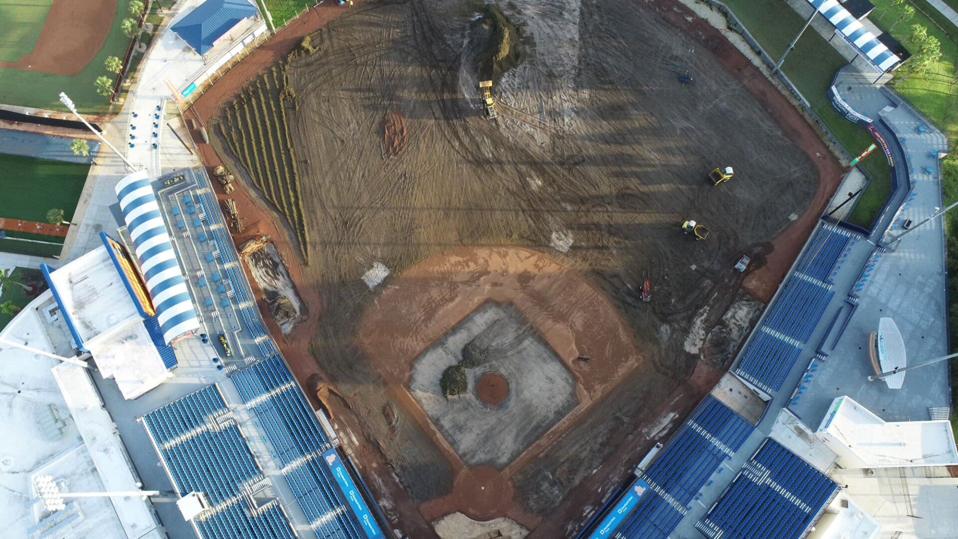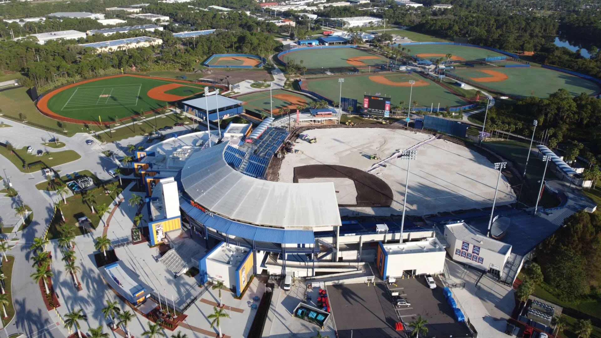The LandTek Group® successfully executed the NY Mets Clover Park Stadium Renovation Project in Port St. Lucie, FL. This project included several key components, such as the installation of new synthetic turf featuring specialized elements like a home plate halo and the NY Mets logo, as well as a visitors bullpen and porous pad. To ensure optimal drainage, we meticulously implemented a subsurface permeable aggregate base, a sub-drainage piping system, and treated wood edgers and nailers. Additionally, the renovation involved the removal of the existing outfield fence and the installation of a new fence, enhancing both the functionality and appearance of the stadium.