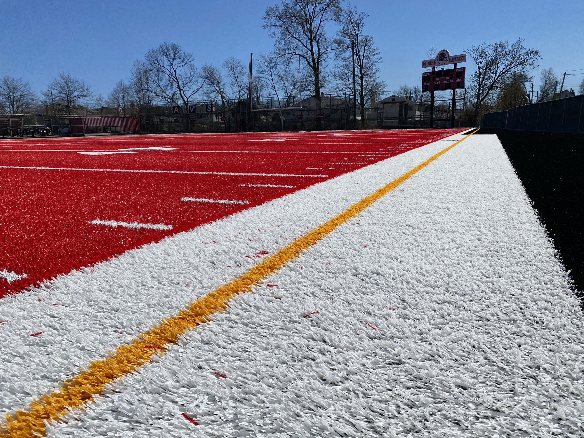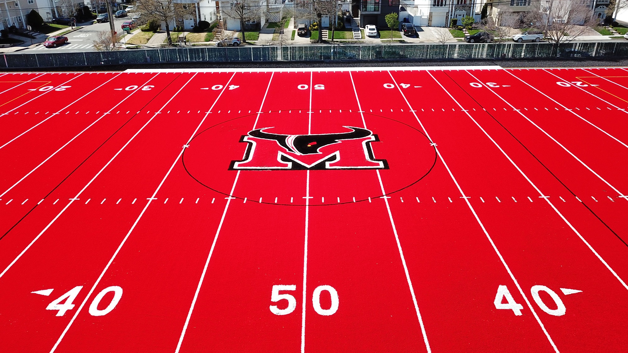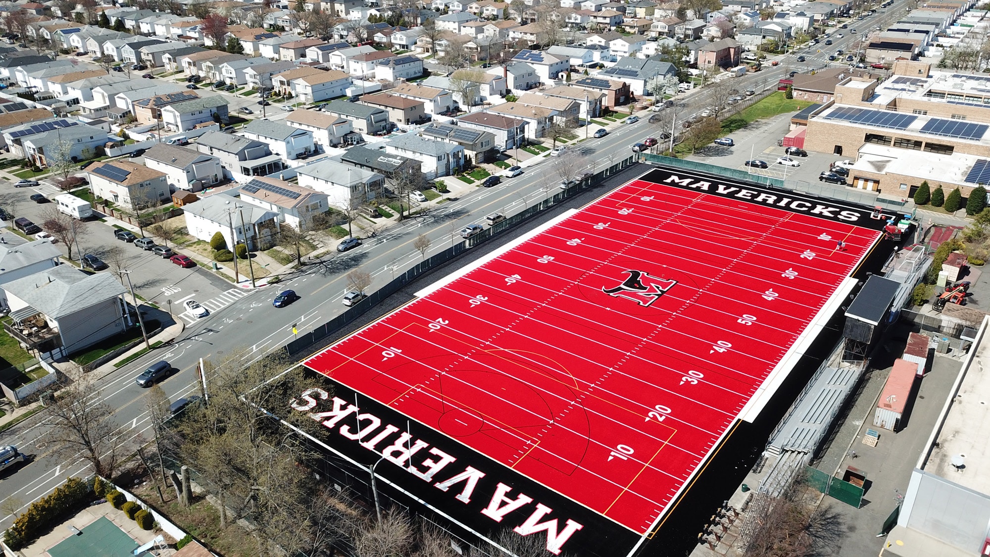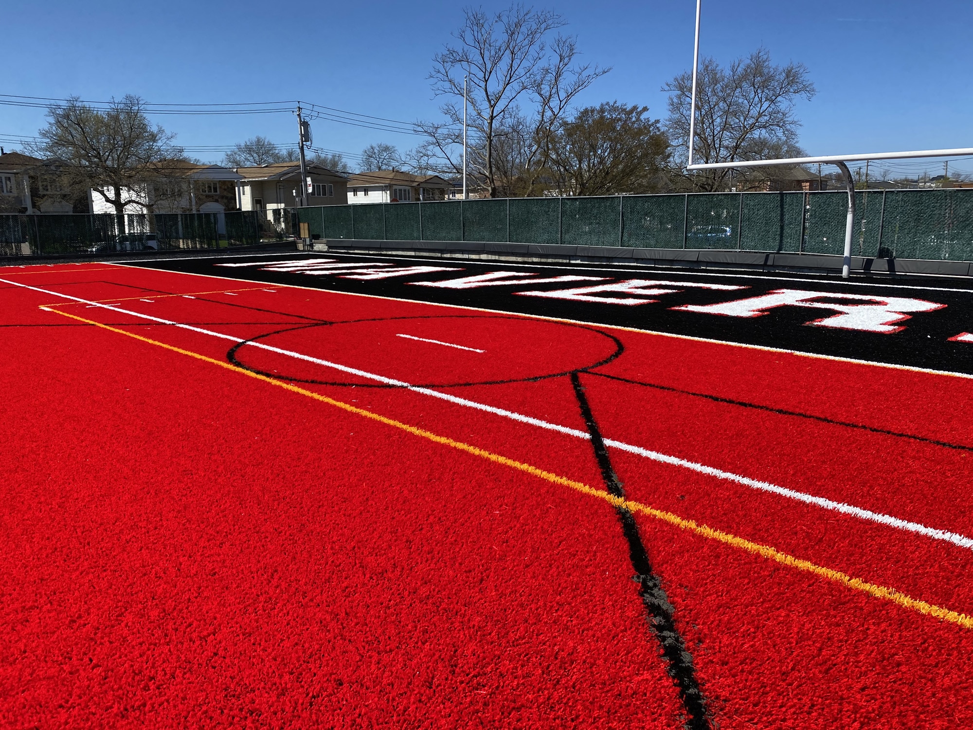 After 14 years, Moore Catholic of Staten Island, NY looked to The LandTek Group® to replace their existing artificial multipurpose turf field with a new and improved synthetic surface. The 72,000 sq. ft. field is decked out in the Moore Catholic red with black accented endzones. The red field is the only one of its kind in New York State. The field is complete with inlaid lines for football, soccer, and girls lacrosse.