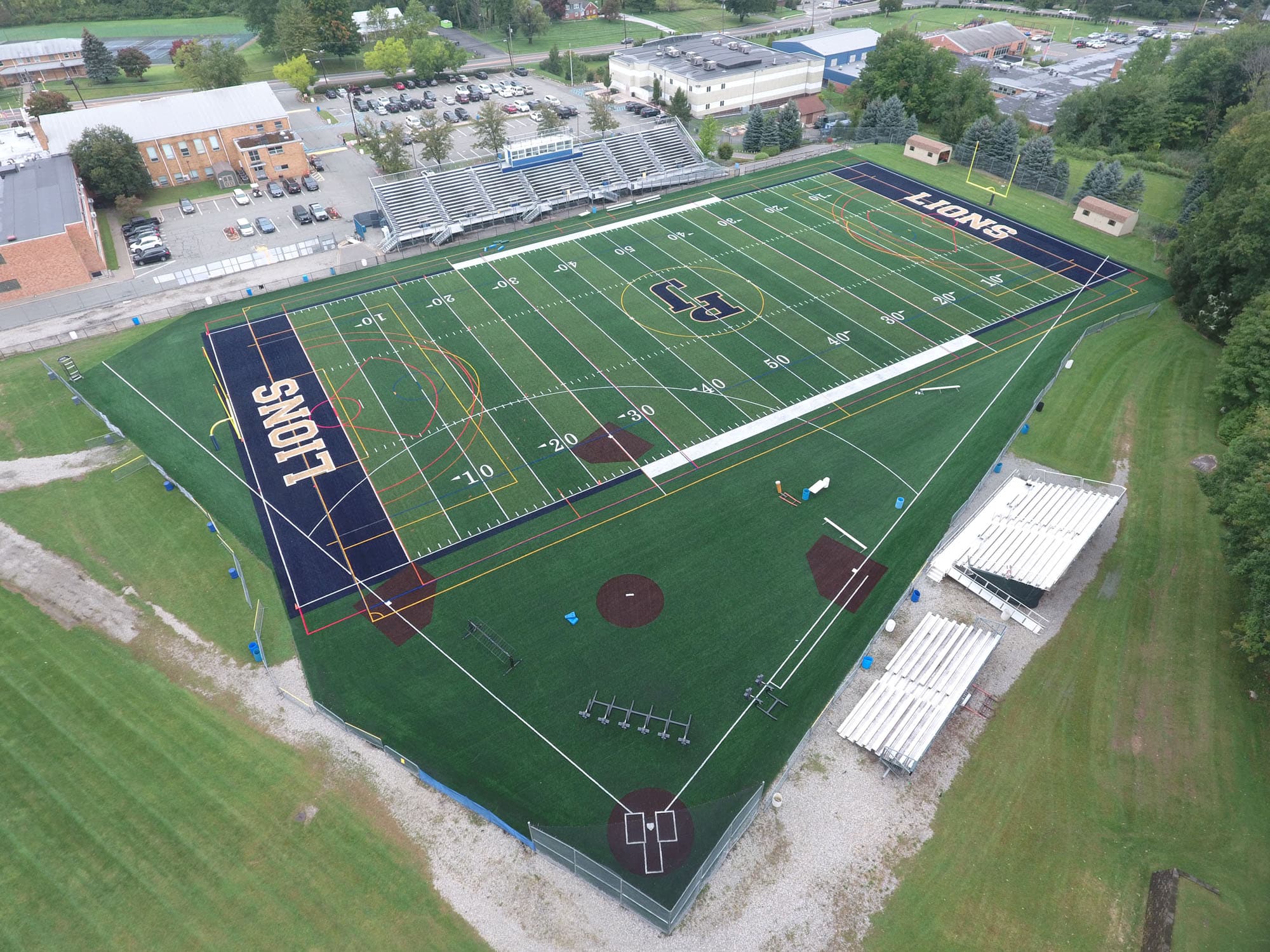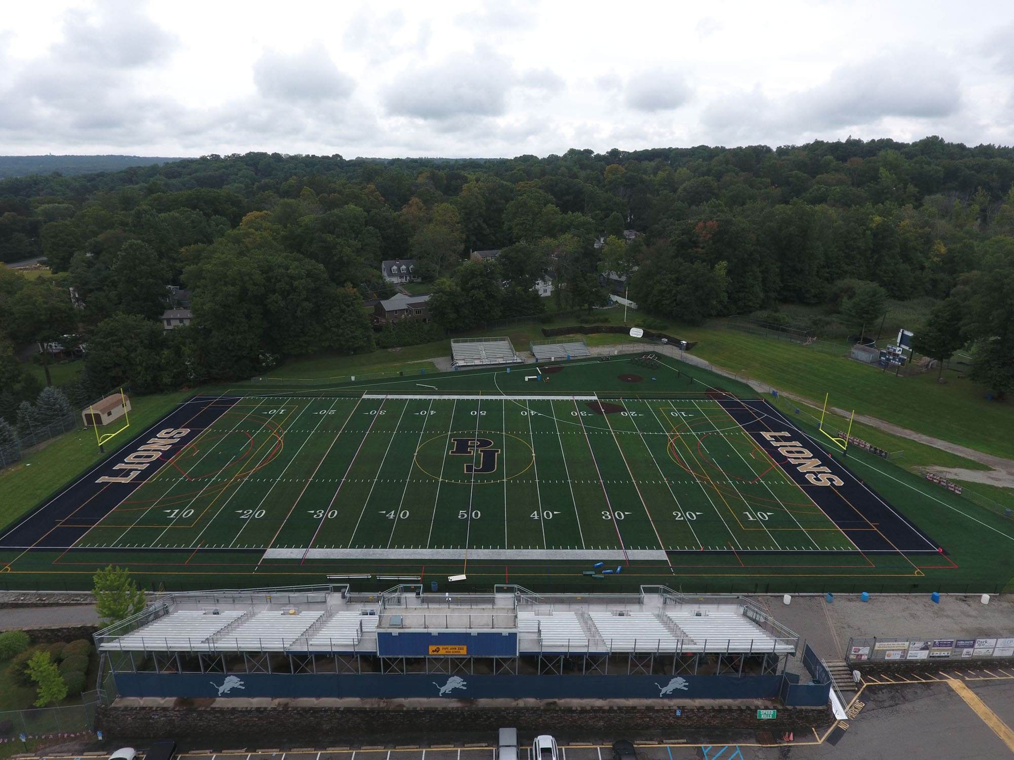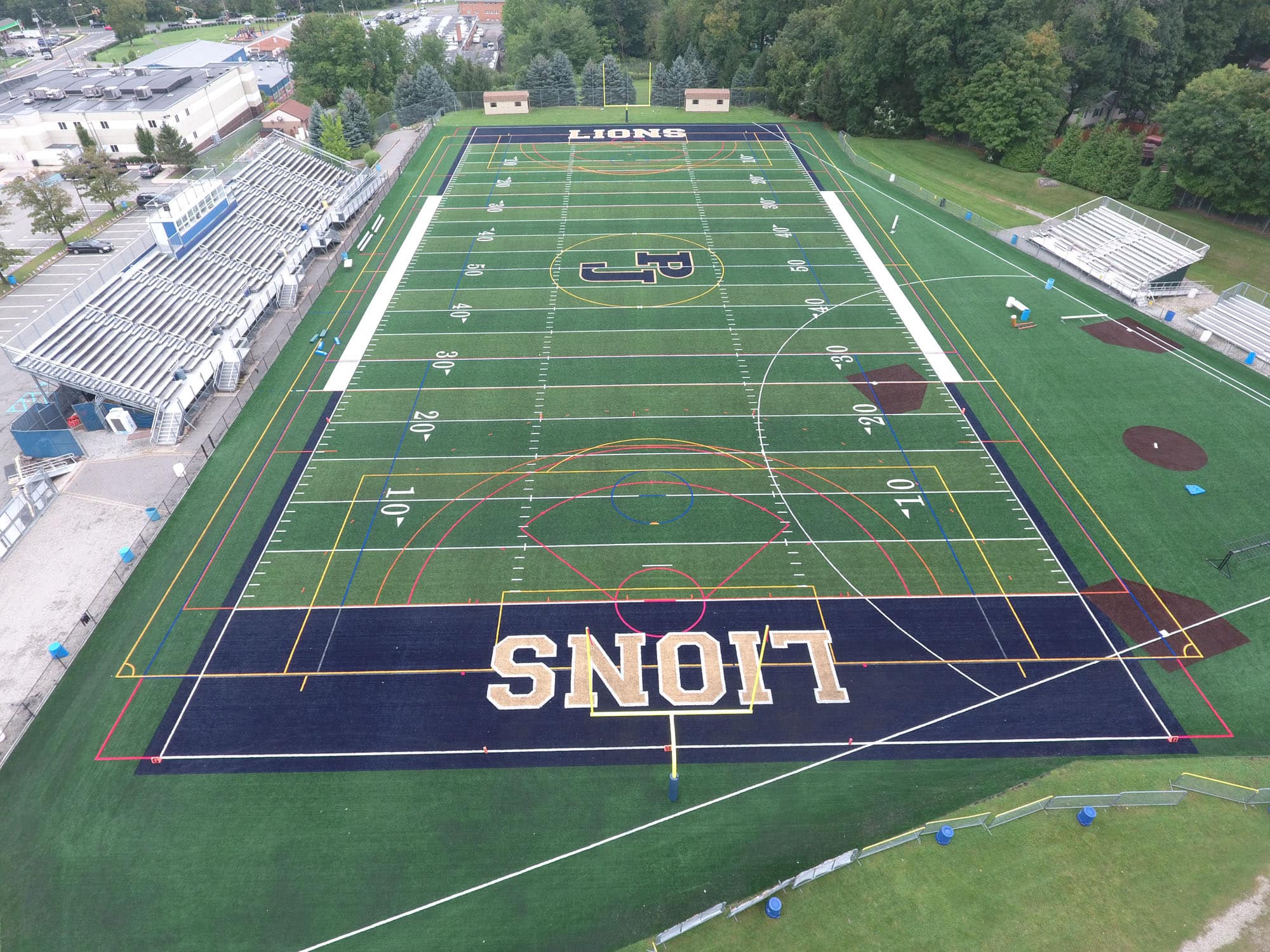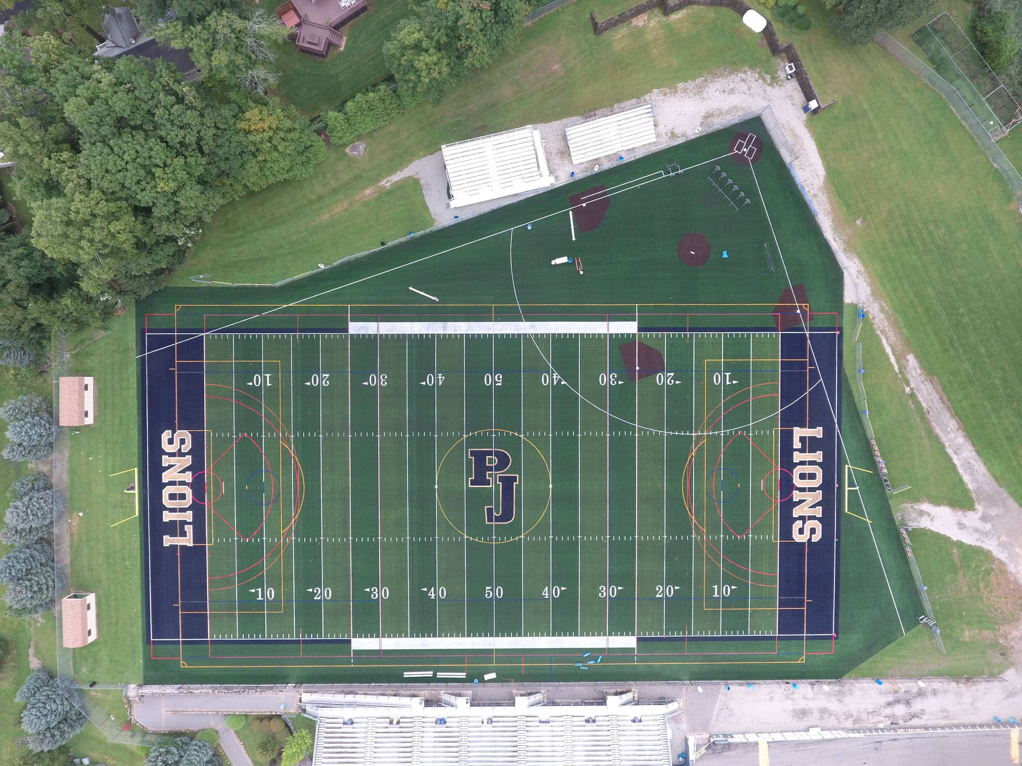 Pope John XXIII Regional High School in Sussex, NJ recently upgraded their multipurpose field. LandTek replaced 95,000 sq.ft of synthetic turf. The new multipurpose synthetic field includes inlaid lines for Football, Soccer, Boys & Girls Lacrosse and Field Hockey. The large field also includes a 90’ baseball field. New colored endzones and center logo were also added.